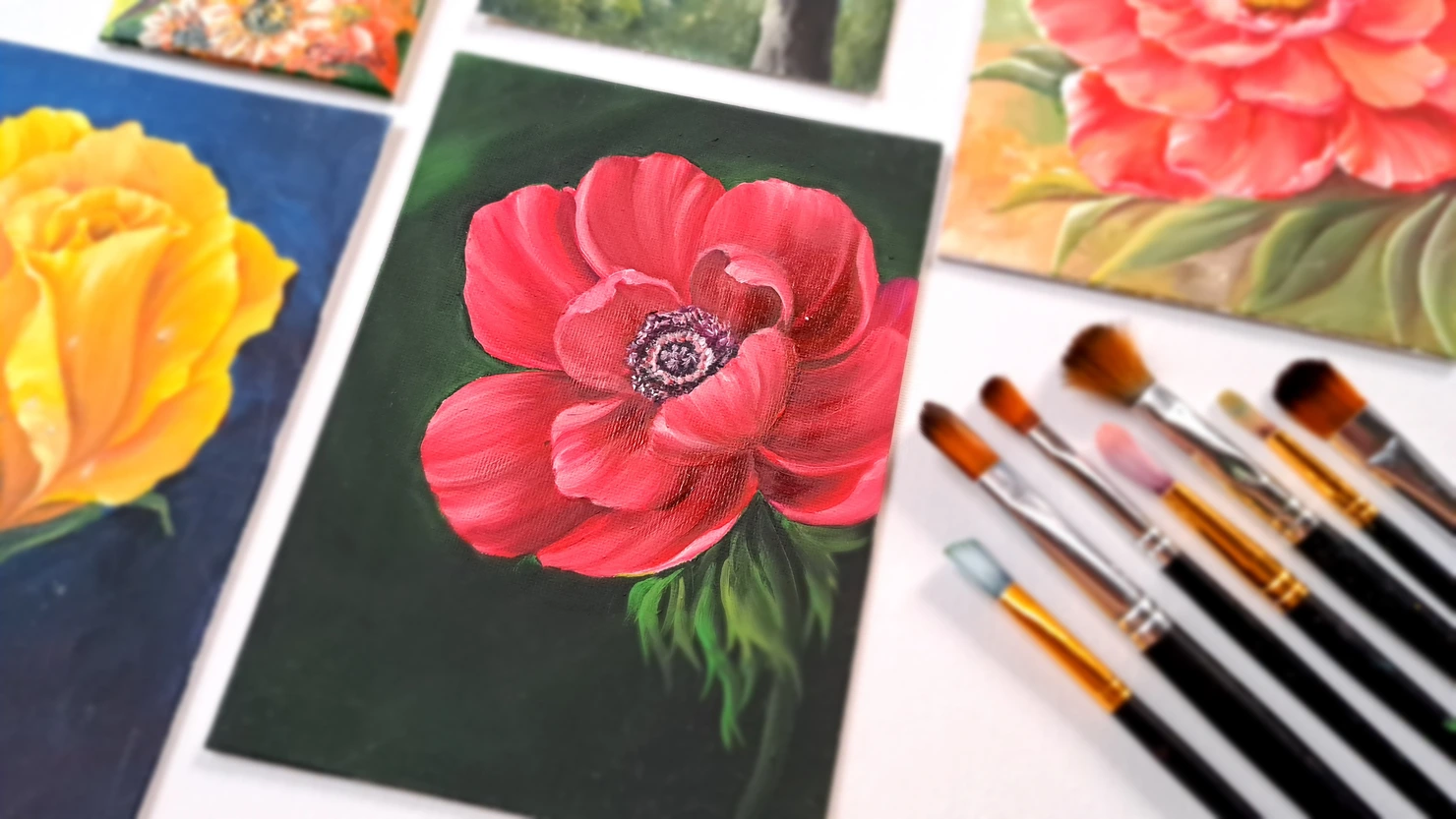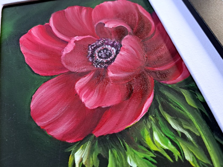 Lleva en sus pétalos una serie de símbolos poéticos; se llama Anémona roja y forma parte de esta colección de Cuadros pintados con temas florales bajo la técnica de pintura mixta (composición de acrílico y acabados con óleo) sobre lienzo o canvas.
